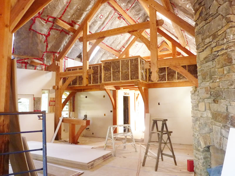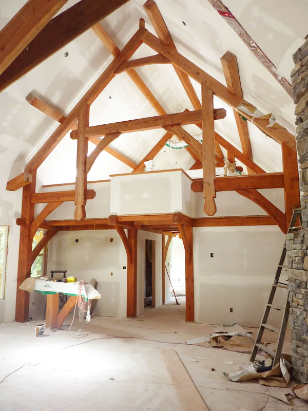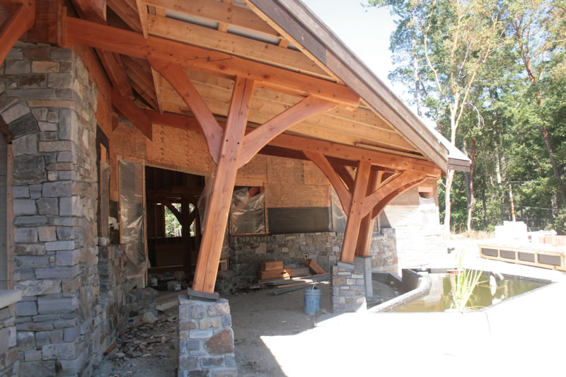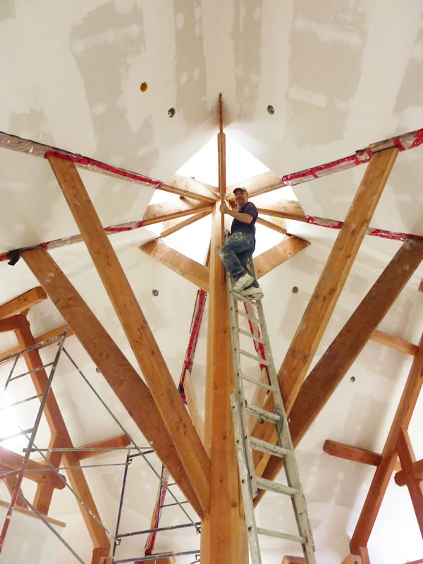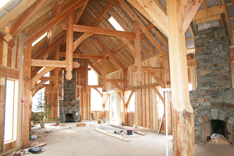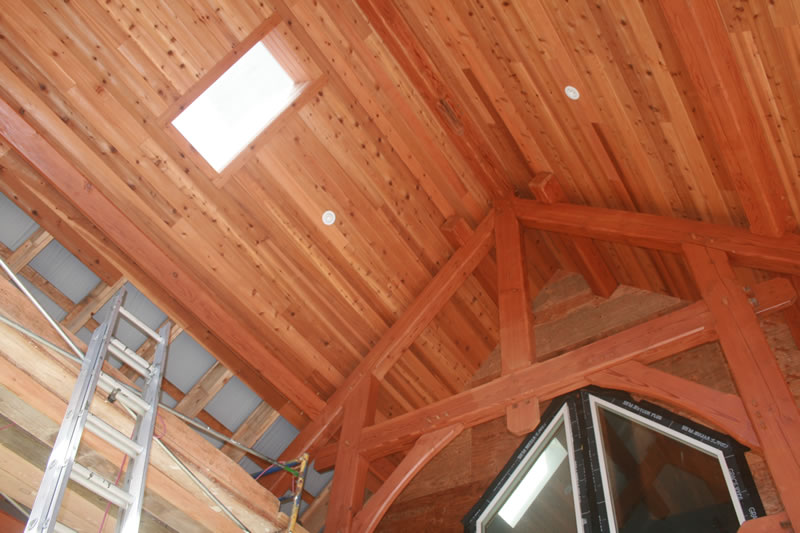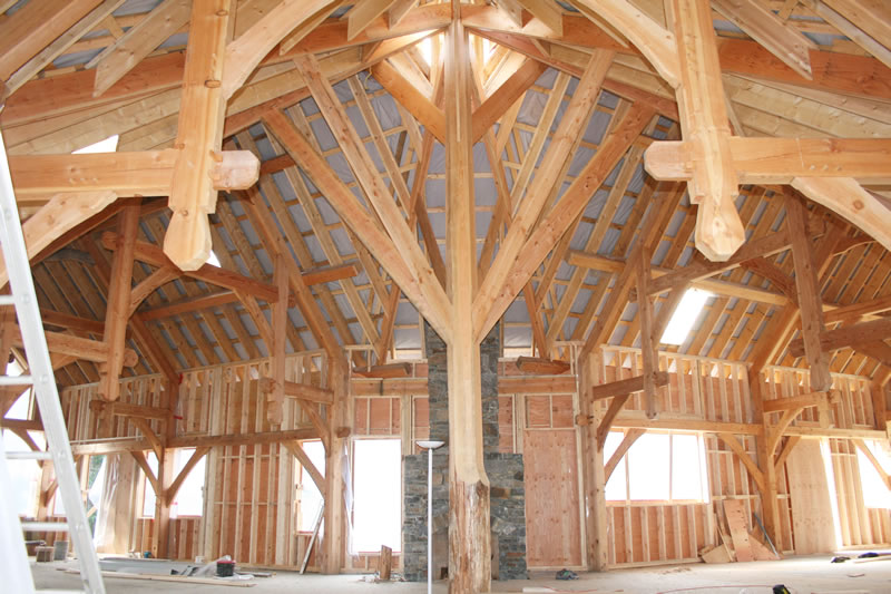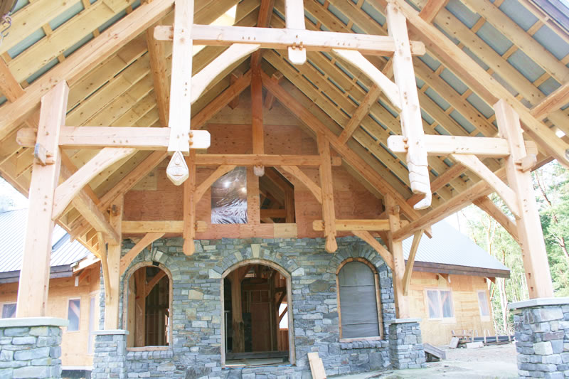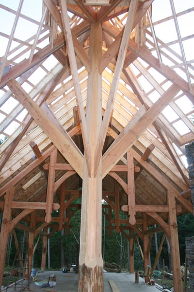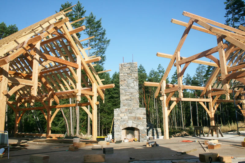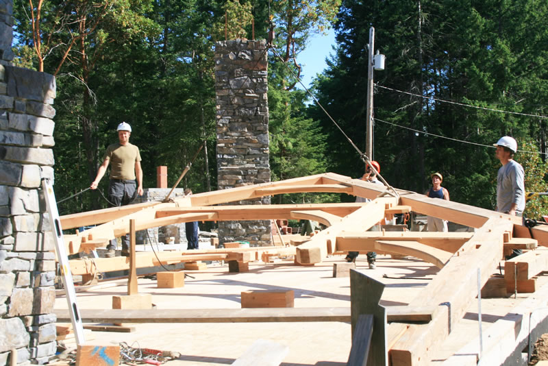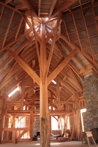 Over the past four years, something special has been happening at the ISBA campus, we are building a great hall to showcase and celebrate our student’s talent. Rock and Timber form a functional symbol of strength and beauty. Nine student-built Hammer Bents, three sets of timber frames, converge like a peace sign to create a hexagonal center, creating 3000 sq.ft. of vaulted cathedral space. Four student-built rock Rumford fireplaces, three inside, another on the deck...rock piers and arched walls.