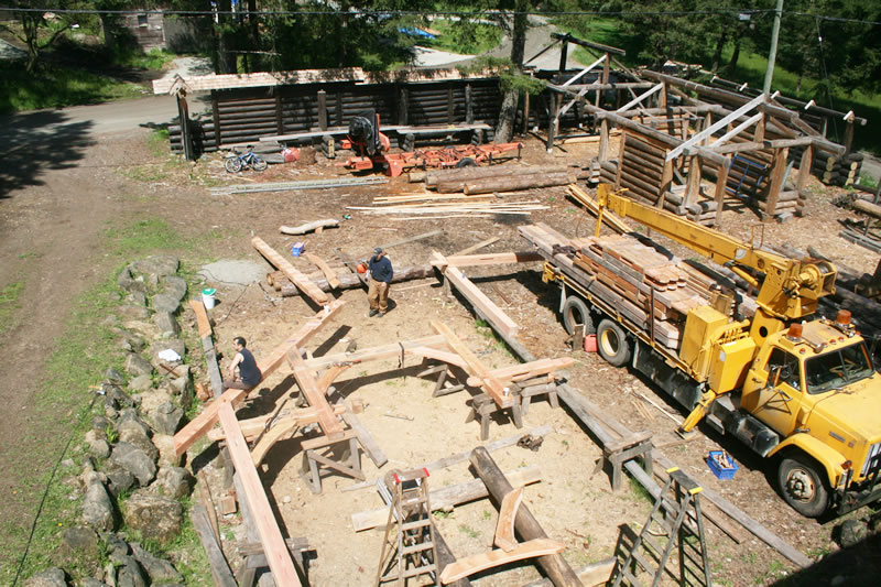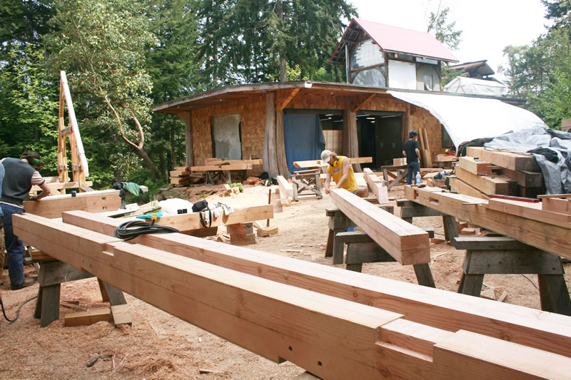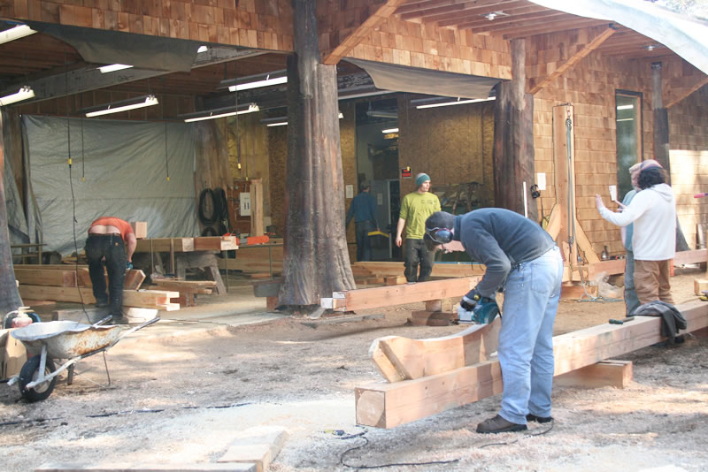 The Shop at ISBA is a behemoth 5000 ft2 structure held up with 4’diameter natural cedar posts. It is build with the Hiada long house style in mind. Included in the shop space is an enclosed tool room portion. This houses all of the power and hand tools a student will use while they are at ISBA. The main portion of the shop is a large high ceiling space used for crafting timber joints as well as for lofting and test fitting the huge Hammer Bents.