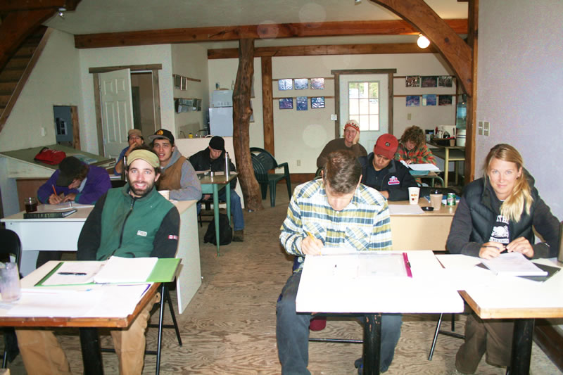 ISBA’s student lounge is a 1200 ft2, 1 ½ story Cedar Timber Post and Beam structure. This building was built by students in the class of 2002. There is a student built Rumford stone fireplace in this structure as well. The lounge is the home of our student class room. This is where all of the theoretical components of our courses are laid out and taught. It also contains a small kitchen where coffee and lunches can be made/ heated and enjoyed while basking in the warmth of the fireplace and visiting with fellow students. This structure is plumbed from a cistern and has a full bathroom for the students to use. The student lounge is finished in polystyrene/stucco infill panels and is an excellent finished example of what can be done with what we teach here.